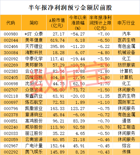需要注意的是,在股市集体狂欢的同时,上市公司半年报业绩预告数据争相浮出水面,其中一些公司面临亏损的可能。证券时报·数据宝统计显示,按照净利润预计上限计算,截至目前,上半年净利润预亏的公司有51家。这其中不乏一些热门题材的龙头股,如锂电池龙头天齐锂业、无人驾驶概念股四维图新、免税概念股凯撒旅业、医疗保健龙头美年健康等。
