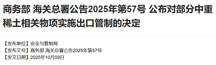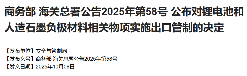 值得一提的是,第55号、56号、57号、58号公告是两部门发布的对涉及超硬材料、部分稀土设备和原辅料、锂电池和人造石墨负极材料、部分中重稀土等相关物项实施出口管制。