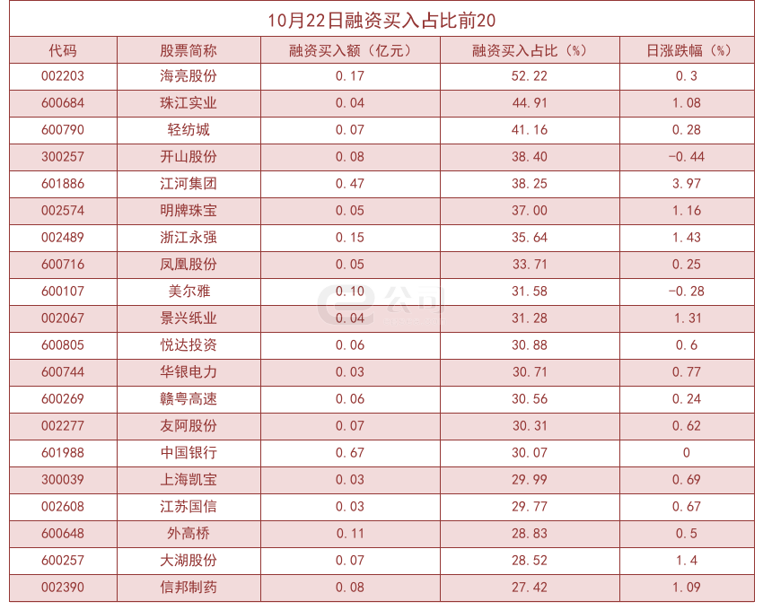个股方面,沪深两市共有1600只个股有融资资金买入。从融资买入额占当日总成交金额比重来看,共有95只股票融资买入额占比超20%,其中海亮股份(52.22%)、珠江实业(44.91%)、轻纺城(41.16%)排名前三。