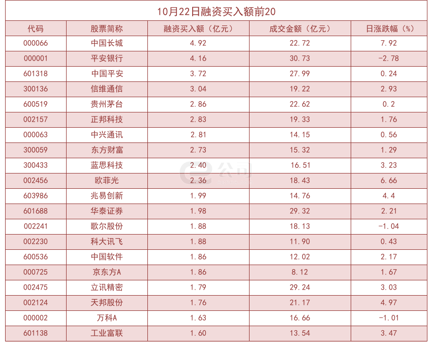 从融资资金买入金额来看,共有40只个股买入金额超亿元,其中中国长城(4.92亿元)、平安银行(4.16亿元)、中国平安(3.72亿元)居前三位。