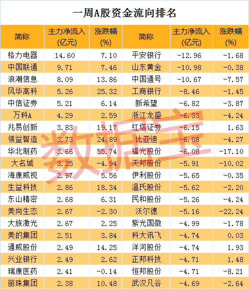 个股方面,剔除近一个月上市的次新股,本周主力资金净流入超亿元的共51股。家电行业龙头格力电器主力资金净流入14.6亿元排名榜首,该股本周上涨7.1%。中国联通、浪潮信息主力资金净流入分别为9.71亿元、8.09亿元,本周分别上涨7.46%、13.86%。本周净流入规模较大还有的风华高科、中信证券、万科A、兆易创新、领益智造等。