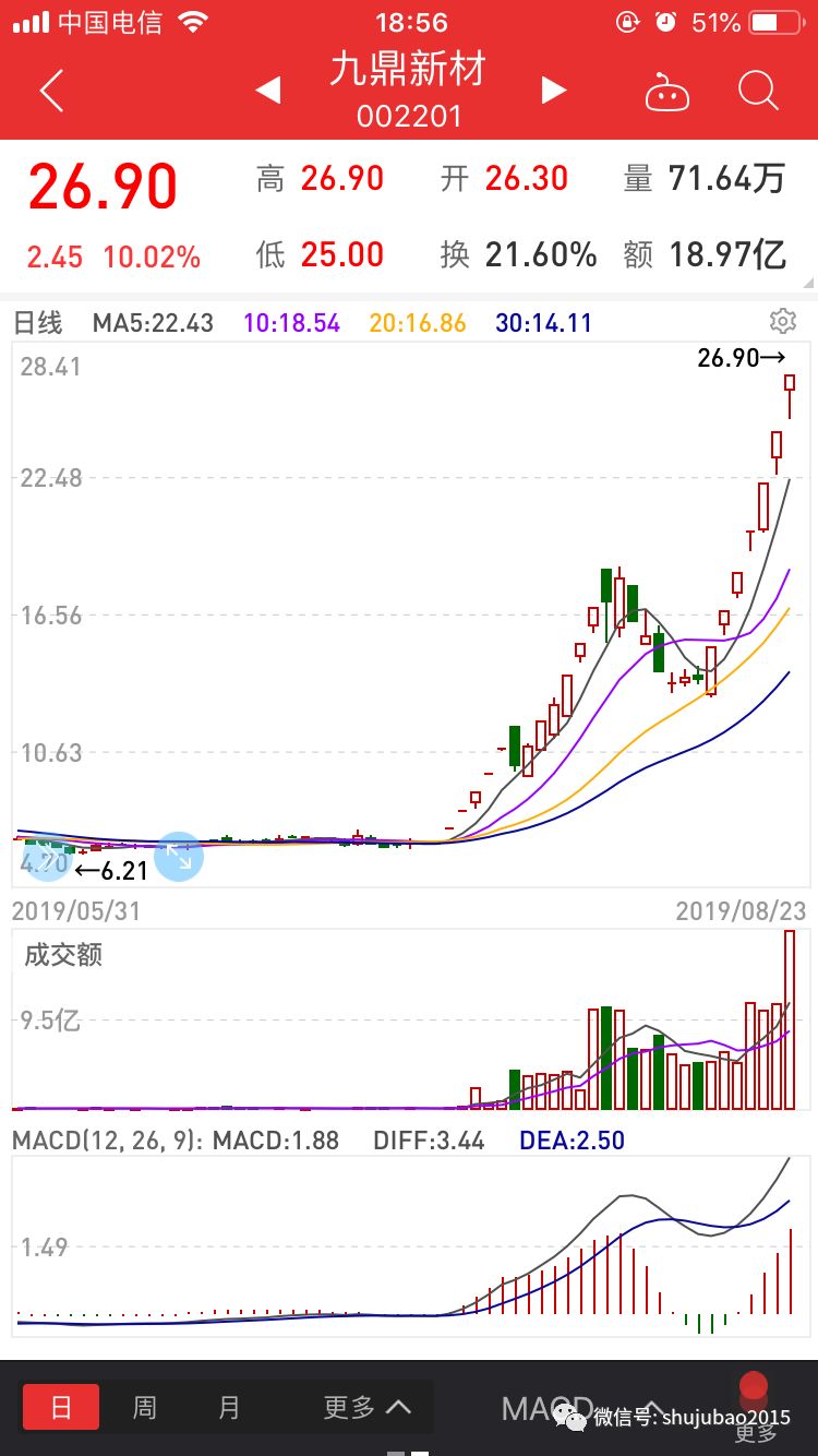 除了受消息面的刺激,游资的接力追捧无疑也是助推九鼎新材暴涨的重要因素。连日来,九鼎新材频频登上龙虎榜,知名游资光大证券深圳金田路营业部、国泰君安证券杭州庆春路营业部、国盛证券宁波桑田路营业部、国泰君安证券北京金融街营业部等先后现身其龙虎榜席位。