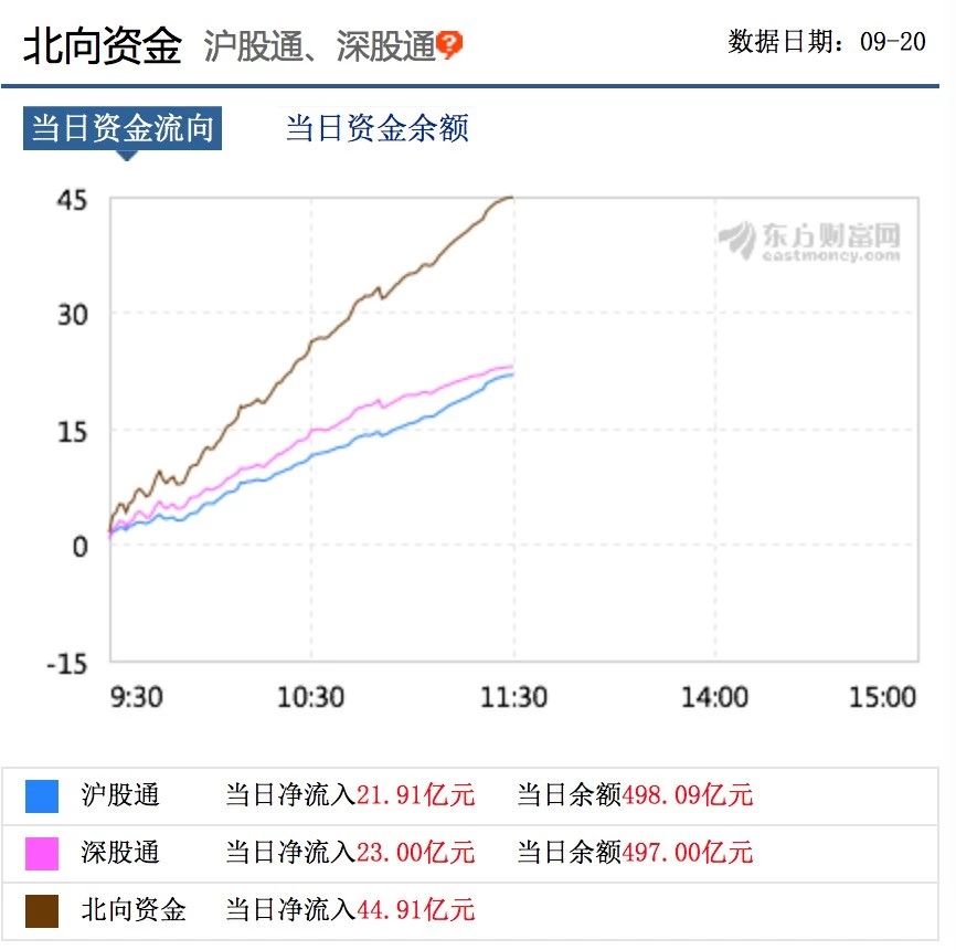 据东方财富网数据,截至9月20日午间收盘,北上资金合计净流入44.91亿元,其中沪股通净流入21.91亿元,深股通净流入23.00亿元。