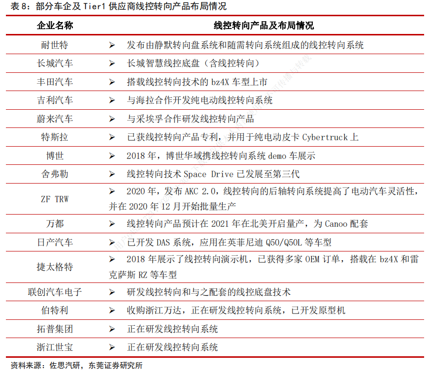 目前,多家汽车制造商和供应商正在积极研发智能驾驶转向系统。一些高端车型已经开始采用或测试线控转向技术。如英菲尼迪Q50、特斯拉Cybertruck和丰田bz4X等车型已搭载线控转向技术。虽然海外龙头企业具有先发优势,但线控转向领域整体仍处于起步阶段,相关技术和产品转化仍未成熟,市场竞争格局尚未形成,具有较大的市场空间。国内多家企业积极研发线控转向技术,未来有望提高国产技术渗透率,在增量市场中占有一席之地。