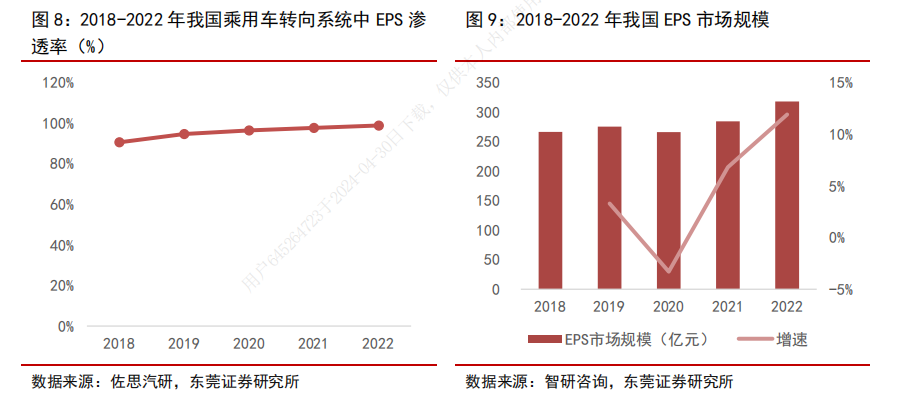 据统计,中国汽车转向系统市场规模从2018年的332.82亿元,发展至2022年的350.48亿元。其中EPS是目前汽车转向系统的主流,渗透率在逐年提升。2022年EPS市场规模达317.92亿元,占乘用车转向系统中的98.80%。