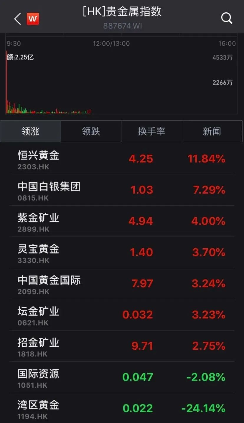 港股方面,截至11:30,Wind港股贵金属指数大涨3.61%。成分股中,恒兴黄金、中国白银集团、紫金矿业、灵宝黄金等涨幅居前。