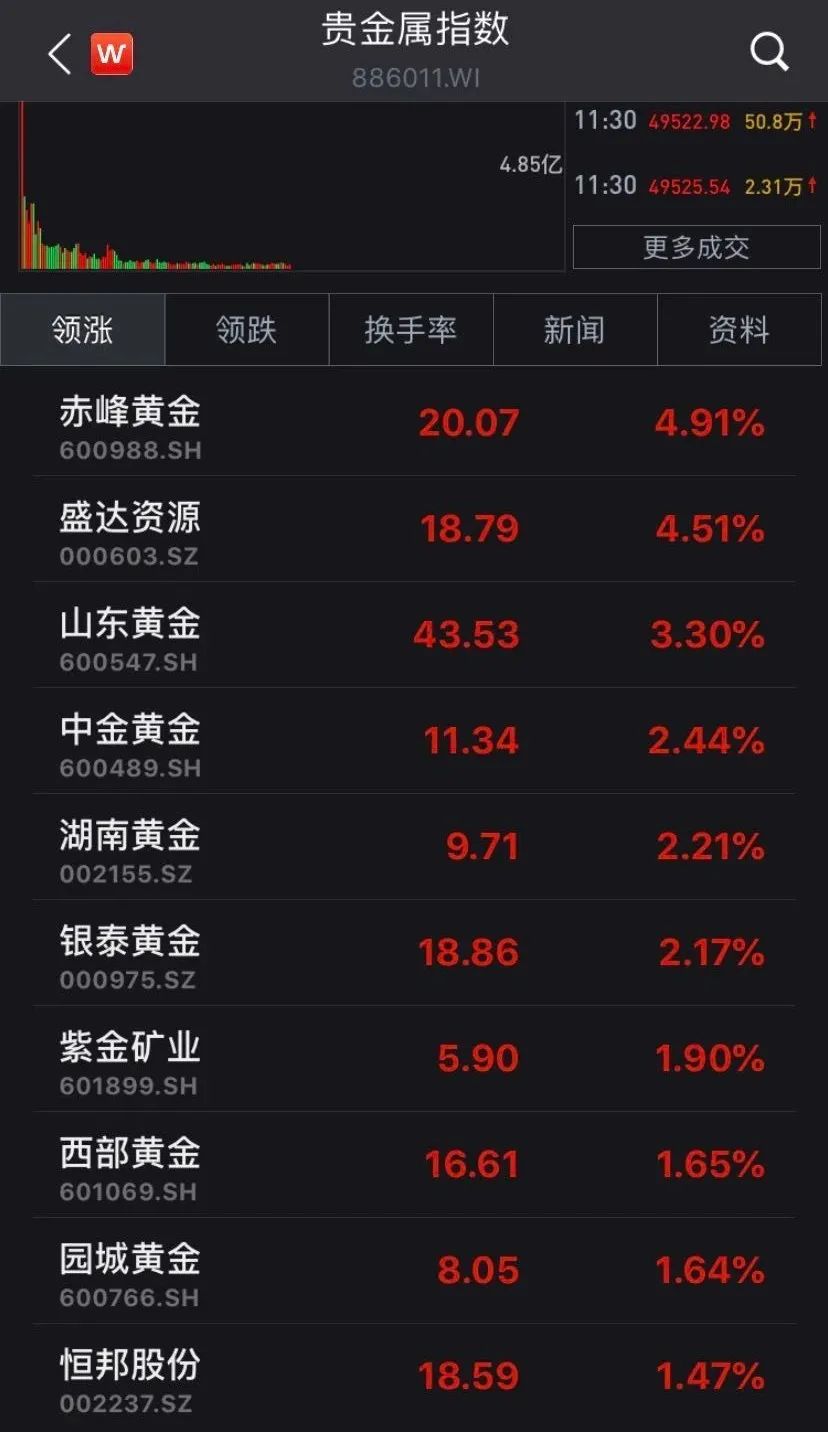 A股方面,截至11:30,Wind贵金属指数涨2.52%。成分股方面,赤峰黄金、盛达资源、山东黄金、中金黄金等涨幅居前。