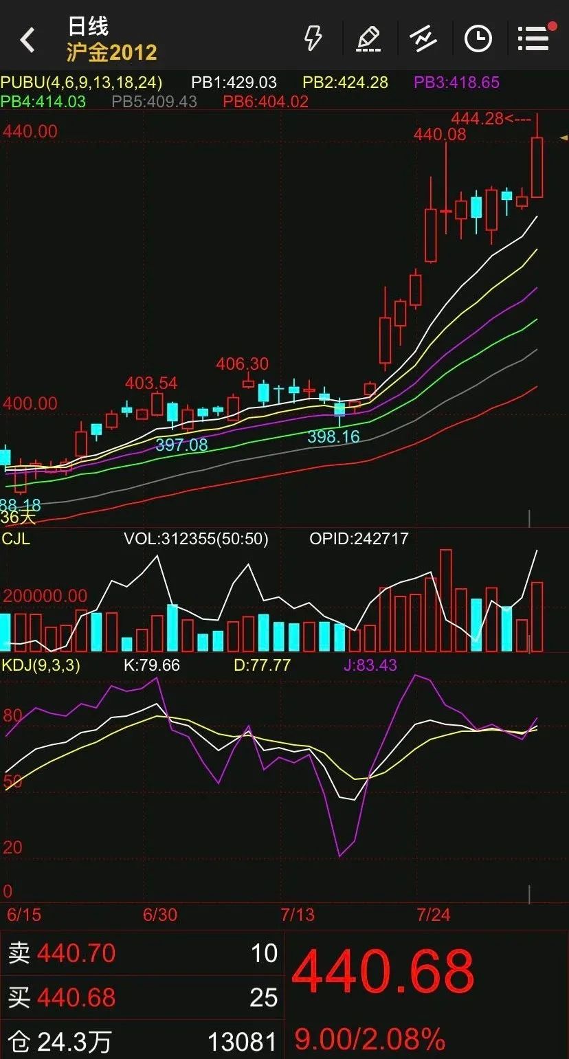 8月5日,国内贵金属期货跟随大涨,文华财经数据显示,截至11:30,沪金期货主力2012合约最高至444.28元/克,再次刷新价格高位,收报440.68元/克,涨2.08%;沪银期货涨幅更为明显,主力2012合约午间收盘报6084元/千克,涨6.46%。