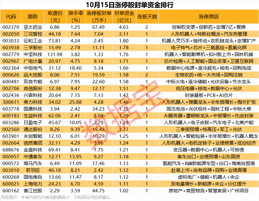 以封单金额计算,26股封单资金均超1亿元,亚太药业、三花智控、征和工业封单资金居前,分别为4.63亿元、3.11亿元、1.8亿元。