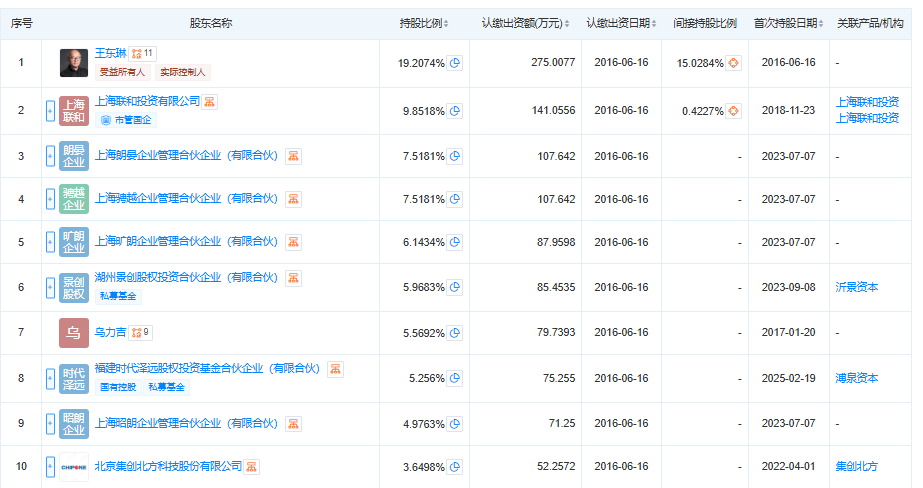 此外,工商信息显示,该公司前十大股东还包括上海联和投资有限公司、湖州景创股权投资合伙企业(有限合伙)、福建时代泽远股权投资基金合伙企业(有限合伙)、北京集创北方科技股份有限公司等,持股比例分别为9.8518%、5.9683%、5.256%、3.6498%。