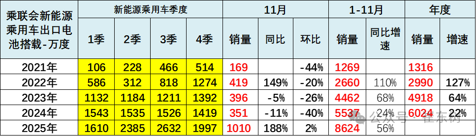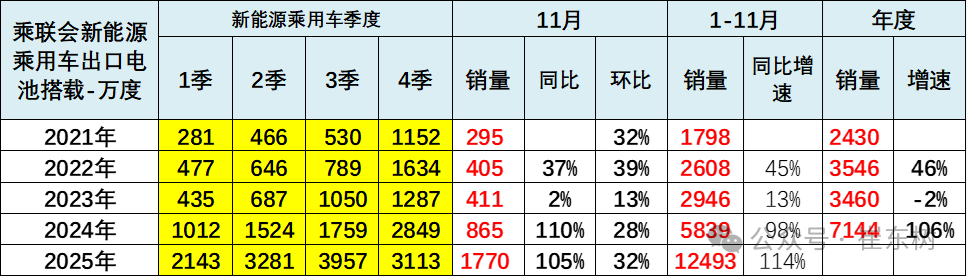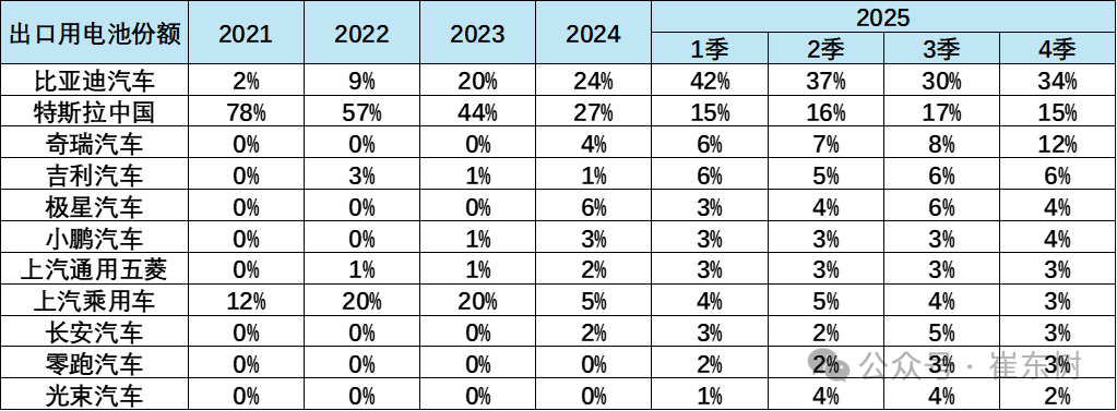 2025年4季度的比亚迪新能源车出口超强,拉动出口用电池增长较大。社会电池供应商的出口整车用电池增长较小。