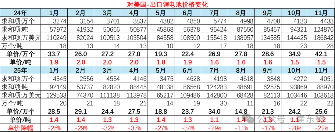 2025年中国大陆对美国锂电池出口总体大幅下滑,从去年的18.7亿美元,下降到今年的10.4亿美元,金额下降45%,而且出口单价也下降22%。这体现了美国的AI带来的电力和储能的暴增,目前尚未与中国出口的锂电池相关。