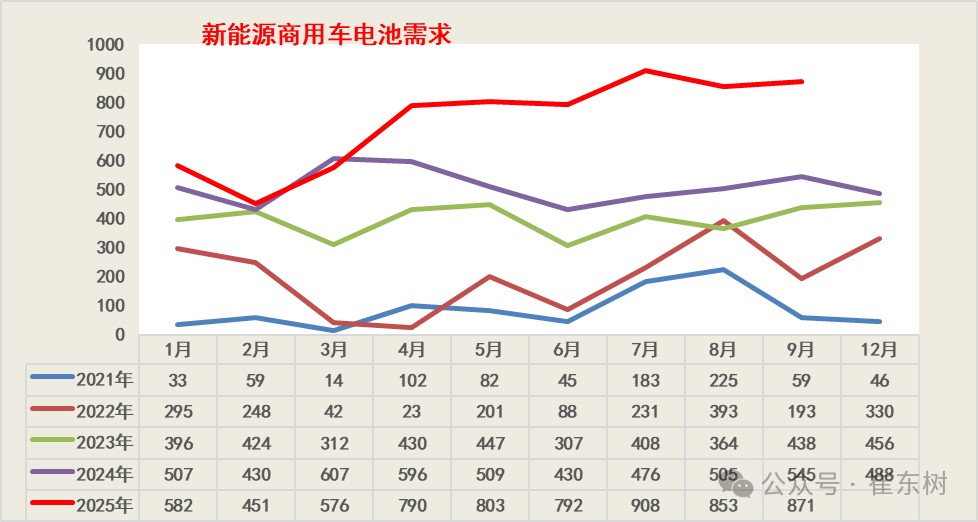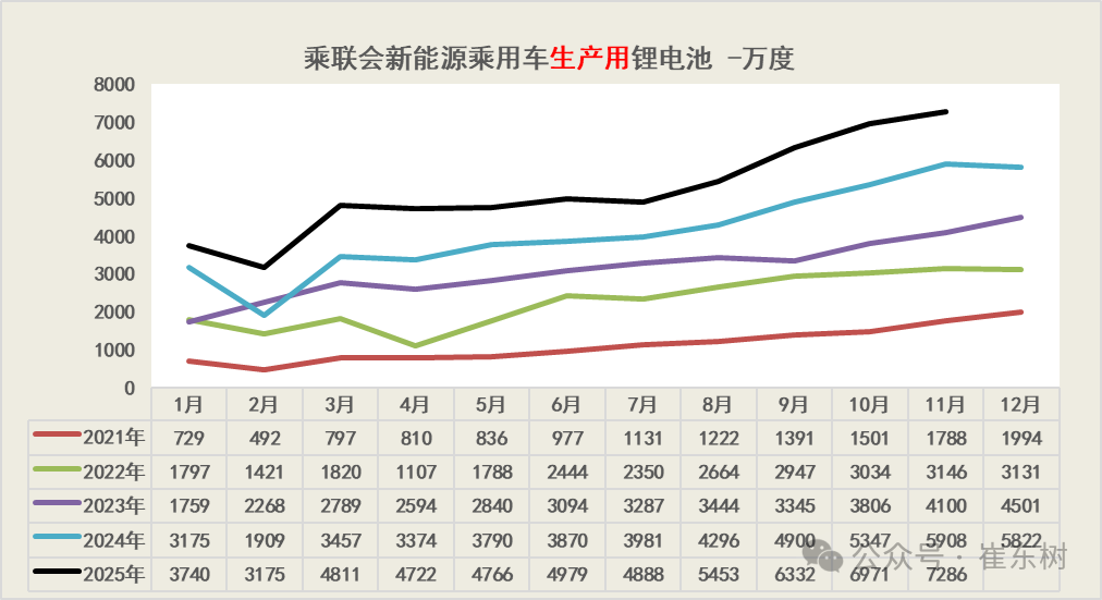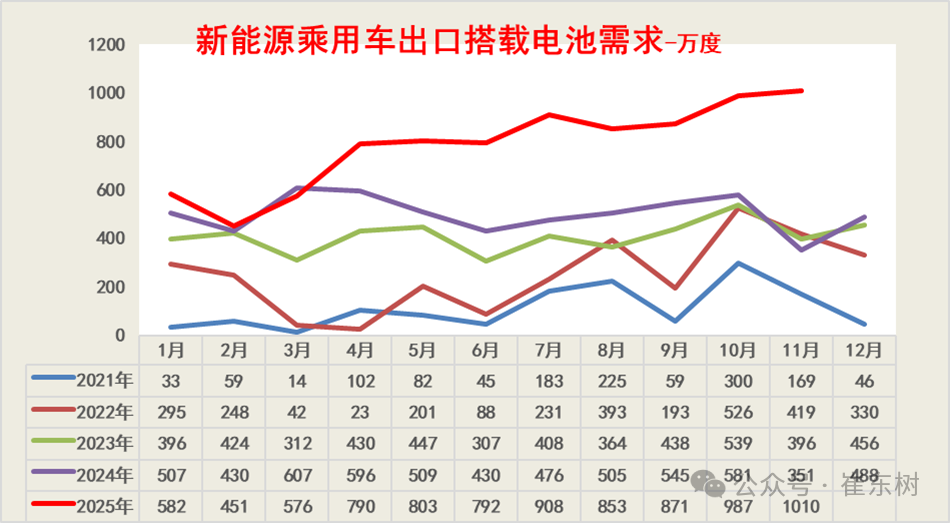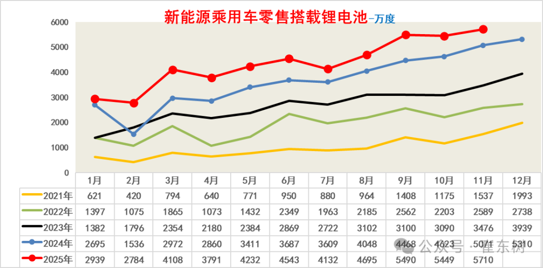 根据乘联数据,新能源乘用车的国内零售的锂电池需求明显疲软,11月仅有5710万度,10-11月走势偏弱。