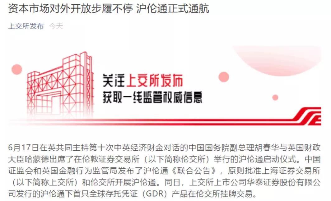 同日,上交所上市公司华泰证券股份有限公司发行的沪伦通下首只全球存托凭证(GDR)产品在伦交所挂牌交易,首家“A+H+G”公司诞生。