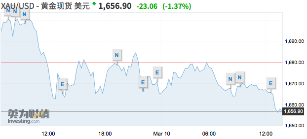 作为避险资产,黄金的表现异军突起,3月9日金价一度冲至1703.1美元/盎司,创2012年12月以来新高。然而,尽管隔夜欧美股市仍大幅下跌,10日盘中黄金价格明显走低,跌幅一度超过1.5%触及1654美元/盎司。