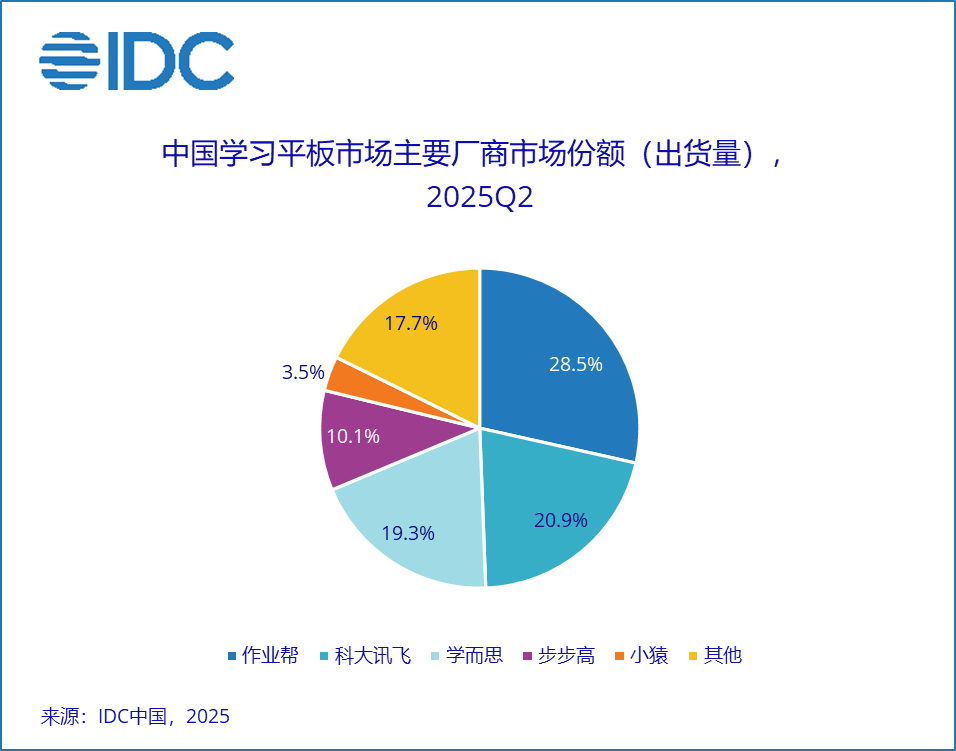IDC表示,中国学习平板市场“马太效应”日趋明显,头部厂商依托丰富的内容资源、领先的 AI 能力及完善的渠道布局,不断巩固竞争优势。数据显示,2025年第二季度作业帮、科大讯飞(002230.SZ)、学而思、步步高、小猿位列市场出货量前五,市场份额共计82.3%。