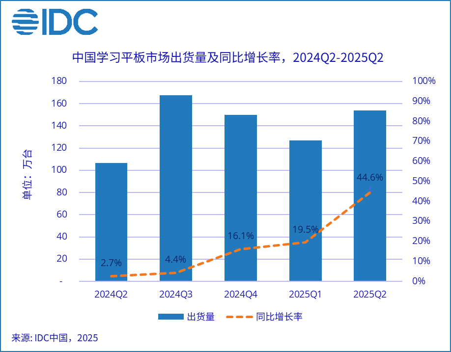 近日,IDC发布了《2025年第二季度中国学习平板市场季度跟踪报告》。数据显示,2025年第二季度中国学习平板市场出货量为154万台,同比增长44.6%。产品功能提升、价格竞争加剧、销售渠道拓展、叠加厂商宣传和国家补贴,共同推动市场规模扩张。