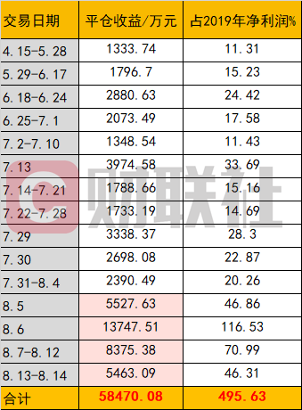 秦安股份投资收益公告显示,8月以来的4次期货平仓,每次收益均超过了5000万元。其中8月6日的平仓收益达到了惊人的1.37亿元,占2019年度净利润的116%;接下来的一周(8.7-8.12),秦安股份再次获得8375万元的平仓收益。