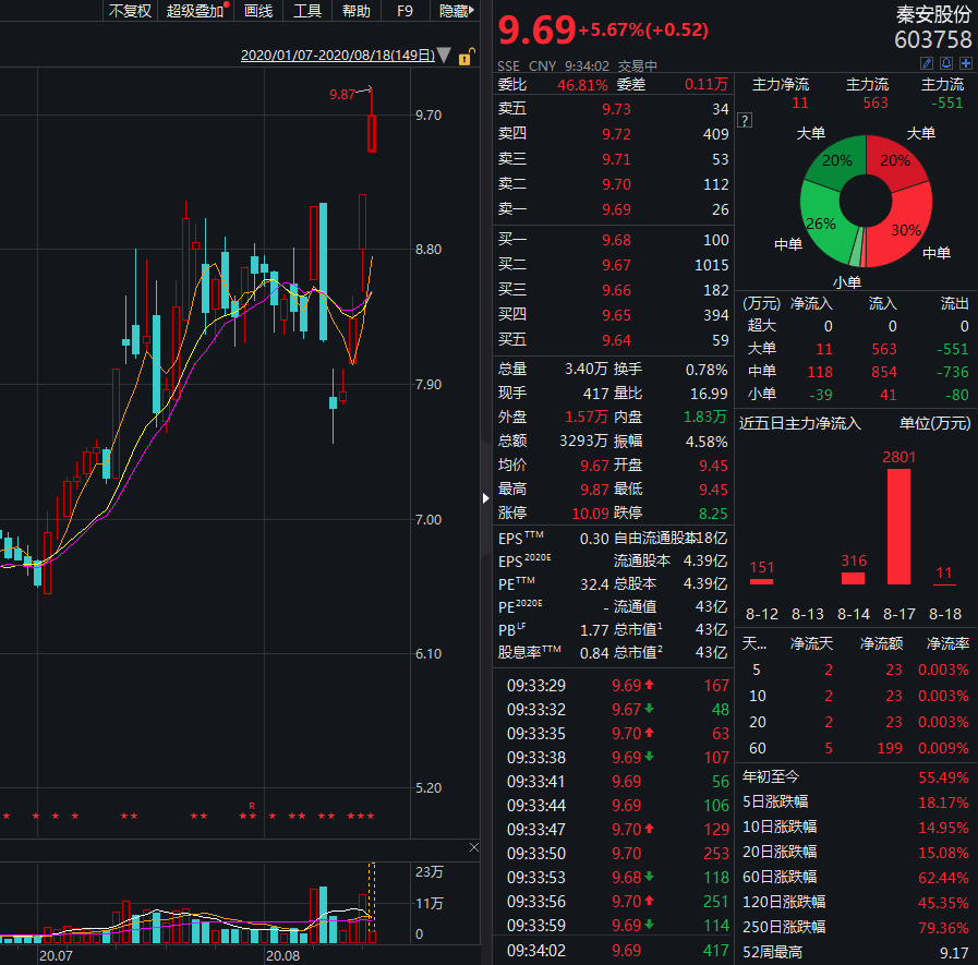 7月以来,秦安股份股价已涨近50%。继昨日涨停后,秦安股份早盘高开近6%,最新报9.69元,市值为43亿元。