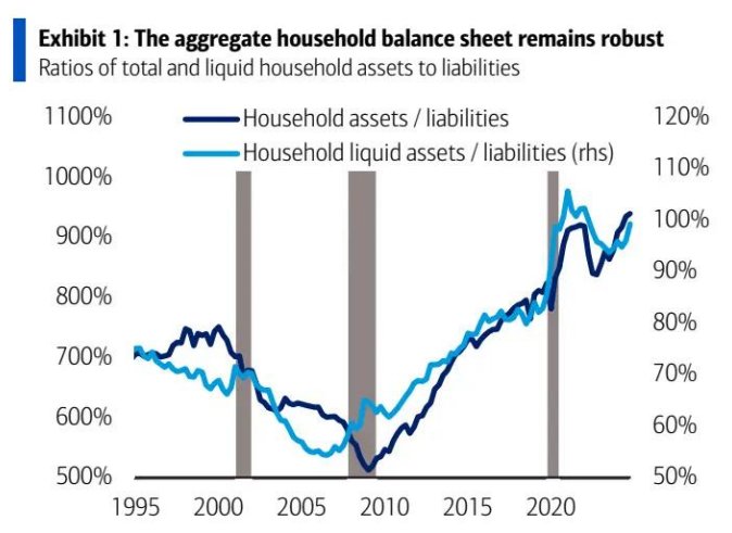 此外,2022 年美国消费者承受的通胀冲击比美银预期的关税影响要大得多。诚然,当时的劳动力市场更为紧张,工资通胀更高。但在美银看来,消费者韧性的一个被低估的原因是家庭资产负债表整体健康。资产(包括流动资产)与负债的高比率使消费者在通胀飙升时能够动用储蓄。如今资产负债表依然良好,因此美银认为,如果通胀回升,消费者仍有 substantial 缓冲。