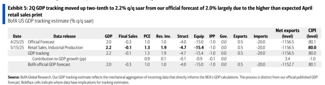 计入 GDP 追踪预测的零售销售核心控制组数据,4 月环比下降 0.2%,高于美银的预期(下降 0.5%)。这伴随着过去两个月数据的净向下修正。然而,餐饮服务(不直接计入追踪预测,但应反映在最终 GDP 数据中)在 3 月被上调,且在 4 月表现强劲。这导致美银对第一季度和第二季度的个人消费支出(PCE)预测有所提高。3 月的商业库存略低于预期,导致美银对第一季度库存的预测小幅下降。