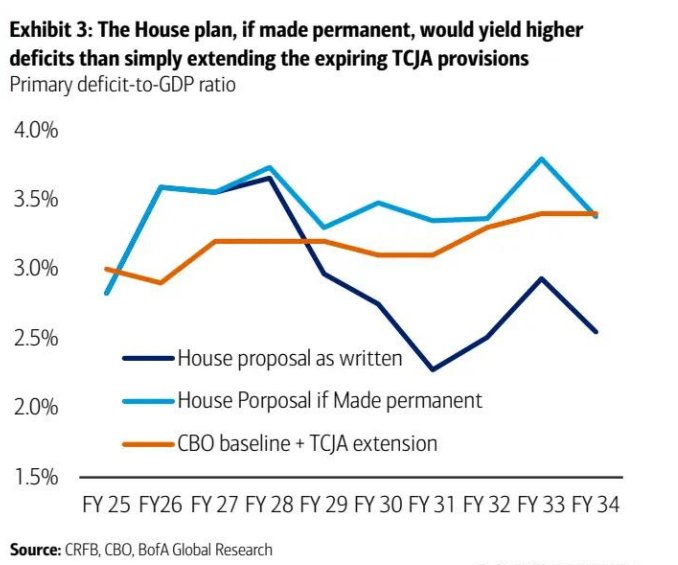 图表 3:如果众议院提案成为永久性政策,赤字占 GDP 的比例将高于仅延长即将到期的 TCJA 条款的情况