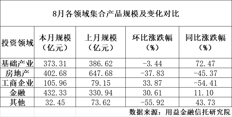 数据显示,8月投向房地产类信托,规模占比为29.9%,较上月减少12.76个百分点;而金融领域信托资金规模占比达到32.1%,较上月增加10.3个百分点,募集规模 98.26 亿元,环比增加 39.69%。同样高增长的还有基础产业类信托,其成立规模占比为27.72%,较上月增加2.25个百分点,募集资金规模 373.31 亿元,与去年同期相比规模增长了 72.47%。