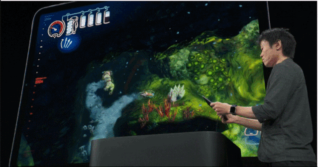 在现场展示中,苹果找来了火爆全球的几款电玩游戏“青蛙过河(Frogger in Toy Town)”“深世海(Shinsekai: Into the Depths)”以及音乐游戏“再见狂野之心(Sayonara Wild Hearts)”的负责人在iPad上进行展示。
