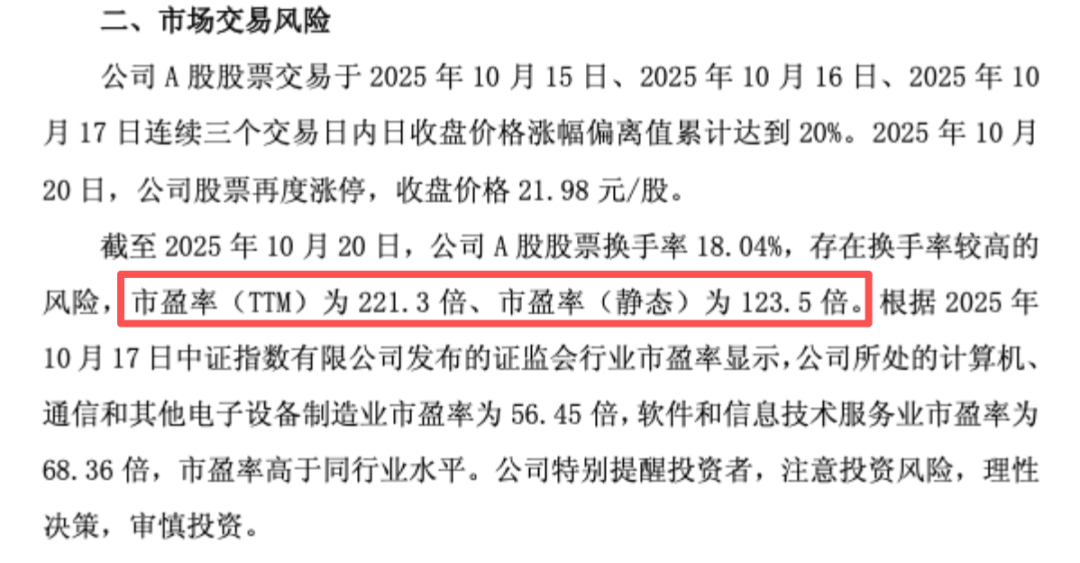 睿能科技公告提示,截至20日,公司A股股票换手率18.04%,存在换手率较高的风险;市盈率(TTM)为221.3倍、市盈率(静态)为123.5倍,高于同行业水平。