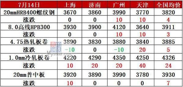 7月14日,国内钢材市场价格稳中有涨,唐山普方坯出厂稳报3400元/吨。国内8家建筑钢材生产企业上调出厂价10-40元/吨。全国25个主要城市20mm三级螺纹钢均价3820元/吨,较上个交易日上涨4元/吨;全国24个主要城市4.75mm热轧板卷均价3885元/吨,较上个交易日上涨5元/吨;全国24个主要城市1.0mm冷卷均价4326元/吨,较上个交易日上涨24元;全国24个主要城市20mm普板均价3930元/吨,较上个交易日上涨7元/吨。