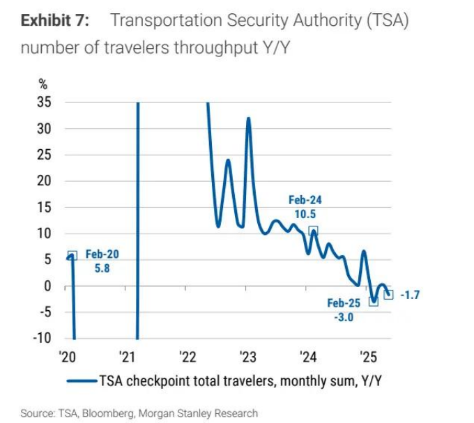 经济大环境应会让风险进一步偏向下行。截至 5 月的航空客运量较 2024 年 5 月放缓了 1.7%(见图表 6 和图表 7 )。在 2 月 “解放日” 之前,客运量同比下降 3.0%,相较于疫情前近 6.0% 的增幅,大幅回落。继续做多美国国债,做空美元。