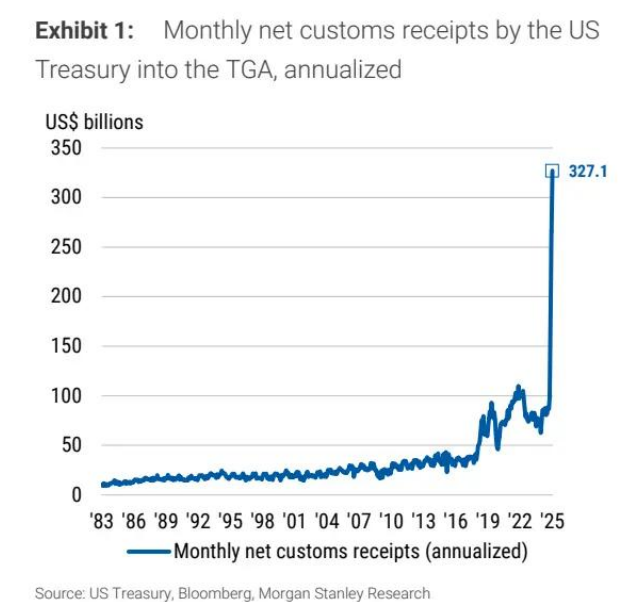 图表 1:美国财政部存入财政部一般账户(TGA)的月度净关税收入(年化)(单位:十亿美元)