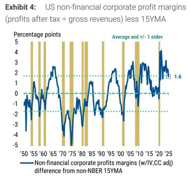 同时,如图表 4 所示,2025 年第一季度的利润率处于其 15 年移动平均值(12.2%)的一个标准差范围内,且呈下降趋势。从 75 年的历史数据可以明显看出,利润率下降往往会先于美国国家经济研究局(NBER)所定义的经济衰退出现 。