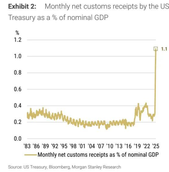 大摩发布研报称,投资者当前的争论点在于“消费者或生产者将承担大部分关税,以及何时会在盈利或消费者价格通胀中体现”,而忽略了一个更重大、更重要的点:美国进口商已开始以显著且被低估的程度支付关税。若将关税视为税收:按年化计算,美国进口商支付的关税相当于2024年企业所得税的65%;从与企业利润的关系来看:2025年6月的美国进口关税按年化计算占非金融企业税后利润的15%;若企业完全承担所有关税支出,2025年第一季度的利润率将从13.8%降至11.7%,远低于15年移动平均值12.2%。