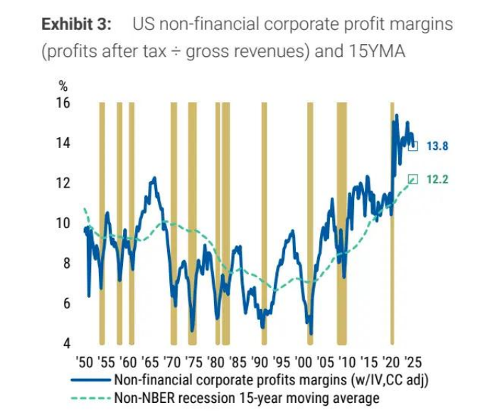 图表 3 展示了美国非金融企业利润率 75 年的历史数据,以及这些利润率的 15 年移动平均值。2025 年第一季度,非金融企业利润率为 13.8%,略低于 2021 年第二季度 15.4% 的历史高位。
