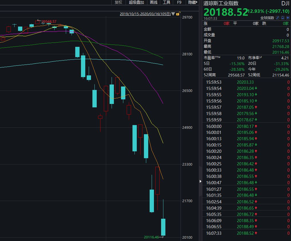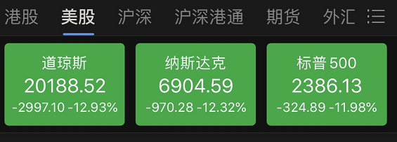 昨夜,美股开盘熔断后,就一直在地位运行,尾盘,美国三大股指再度向下,截至收盘,道指收跌约3000点,跌近13%,创三年以来新低,并创2008年以来最大单日跌幅。纳指收跌12.3%,标普500指数跌近12%。波音跌近24%,领跌道指。苹果跌近13%。