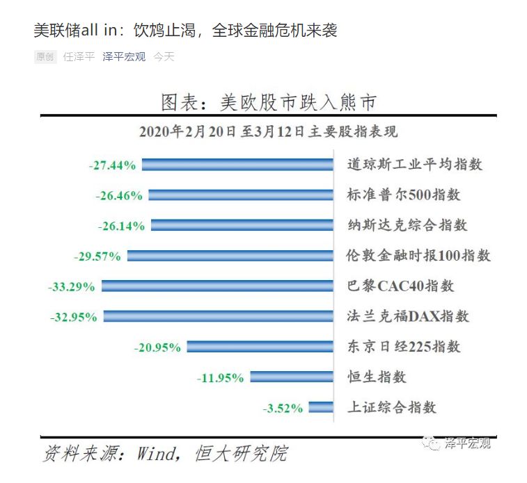 任泽平今日凌晨的最新研报认为金融危机来袭,其表示,全球金融市场雪崩,疫情只是导火索,根源是长期货币超发下的经济、金融、社会脆弱性。2008年国际金融危机至今,12年过去了,美国欧洲主要靠量化宽松和超低利率,导致资产价格泡沫、债务杠杆上升、居民财富差距拉大、社会撕裂、政治观点极端化、贸易保护主义盛行。