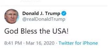 3月16日晚,特朗普在盘前发布了一条推特:愿上帝保佑美国!不过,这条推特并没有阻止美股暴跌,50分钟后,美股再次熔断。