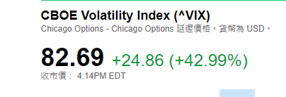 而芝加哥期权交易所波动率指数飙升近25点,接近43%,收于82.69的创纪录高点,超过了2008年11月21日创下的80.74的峰值。