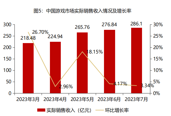 2023年7月中国游戏实际销售收入为286.1亿元,环比增长3.34%,同比增长37.49%,同比增长率连续三个月为正。