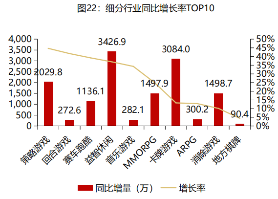 从手机游戏细分行业看,策略游戏、回合游戏等5个行业规模同比增长超过30%,其中益智休闲、策略游戏增量超过2,000万,成为游戏市场持续发展的重要支撑力。