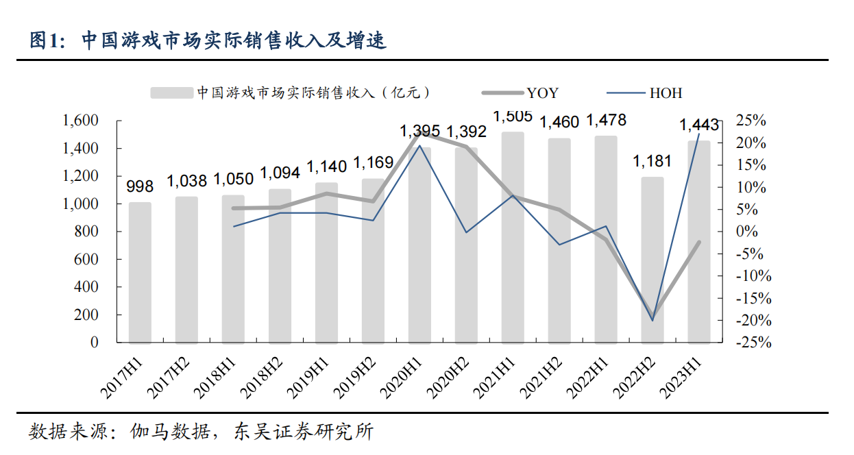 根据伽马数据,2023年1-6月国内游戏市场实际销售收入1442.63 亿元,同比下降2.39%。