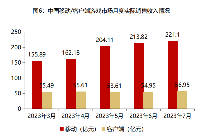 2023年7月移动游戏市场销售收入221.1亿元,环比增长3.40%,同比增长51.09%,主要由于多款新游表现较优,以及6月部分新游首月流水在7月释放;客户端游戏销售收入56.95亿元,环比增长3.64%,同比增长7.64%。