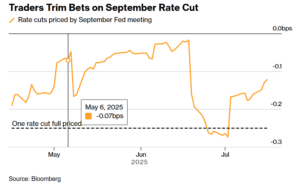 周二公布的6月通胀数据已显现初步信号:特朗普政府大规模加征关税的政策正逐步传导至物价端,这导致市场对美联储降息的预期明显降温,债券市场买盘随之减弱。尽管整体通胀数据低于市场预期,但货币市场数据显示,交易员目前认为美联储9月降息的概率已不足五成。