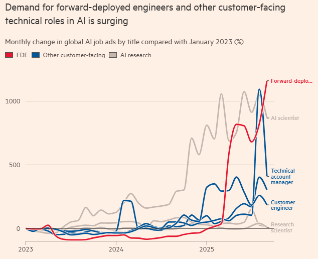 招聘平台Indeed数据显示,此类面向客户的人工智能岗位招聘需求,在2025年出现了激增。今年1月至9月间,FDE岗位的月度招聘发布量增长了逾800%。