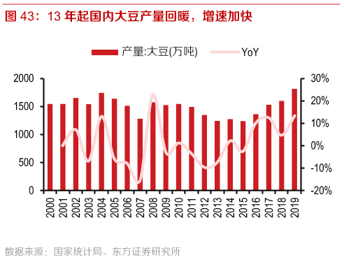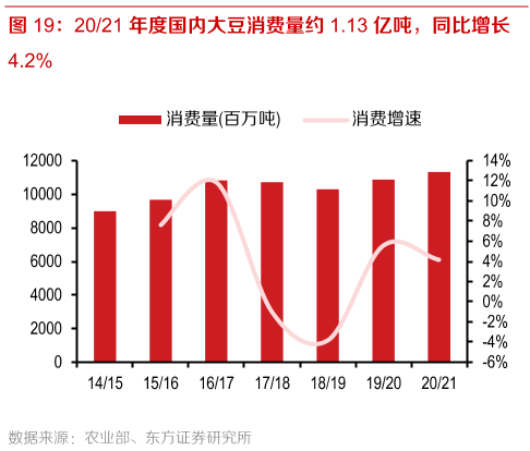 虽然近些年在国家的扶持下,国内大豆产量开始呈现上涨态势,预计今年的大豆产量可达1910万吨,相较于2015年已经上涨了50%。