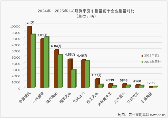 与2024年年终格局相比,2025年1-8月牵引车行业前十成员和座次均发生了变化:去年牵引车排位赛最终名列第12位的宇通,目前暂列行业第10位;去年年终排名第10的远程商用车, 8月过后暂列行业第7;去年年终排名第5位的福田今年8月过后暂列行业第4;去年年终排名第7位的徐工上升一位,暂列行业第6。“你进我退”中也有企业排名出现下滑,甚至被挤出前十。2025年仅剩最后4个月,留给落后企业的时间已经不多了。