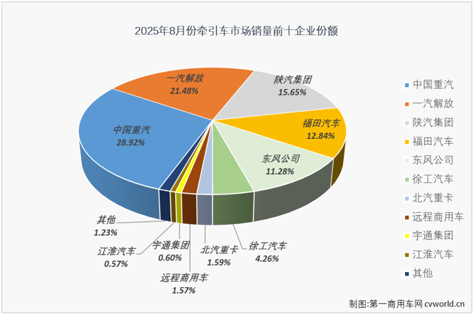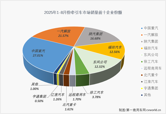 从行业格局看,2025年8月份牵引车市场行业前十成员与7月份一致,排名出现一些变化:宇通和江淮换位,宇通上升一位至月榜第9位;排名月榜前8位的重汽、解放、陕汽、福田、东风、徐工、北汽重卡和远程保持7月份排名不变。