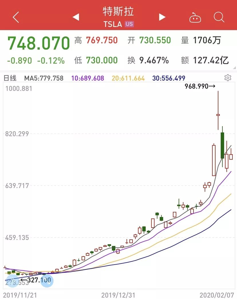 特斯拉在上周上演了大涨大跌的过山车行情,继在2月3日特斯拉美股股价经历19.9%的暴涨、2月4日创下每股968.99美元的盘中最高纪录,以及经过2月5日17.18%的暴跌后,特斯拉于2月7日最终收跌0.89%,最新总市值超1348亿美元。