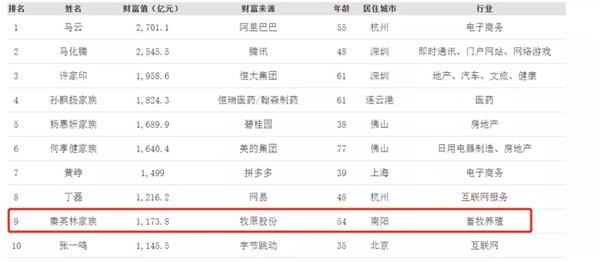 在福布斯2019年度中国富豪榜中,牧原股份的秦英林家族凭借1173.8亿元财富位列第9,成为唯一进入前十的大食品行业代表。